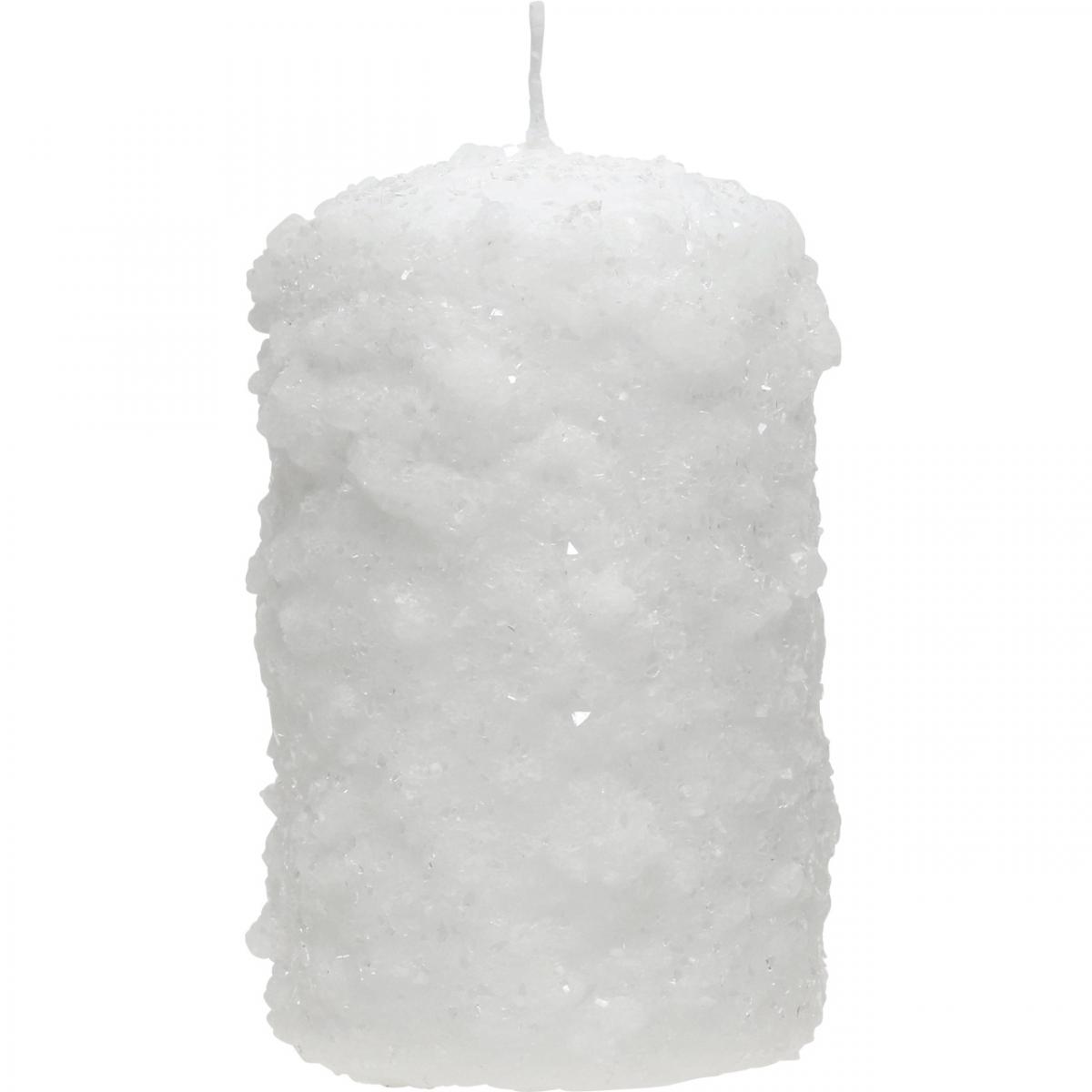 Die Weihnachtskerzen besitzen die Oberflächenstruktur von zusammengedrücktem Schnee und funkeln zudem frostig durch kleine transparente Partikel, die unregelmäßig auf die Stumpenkerzen für den Advent aufgebracht worden sind.