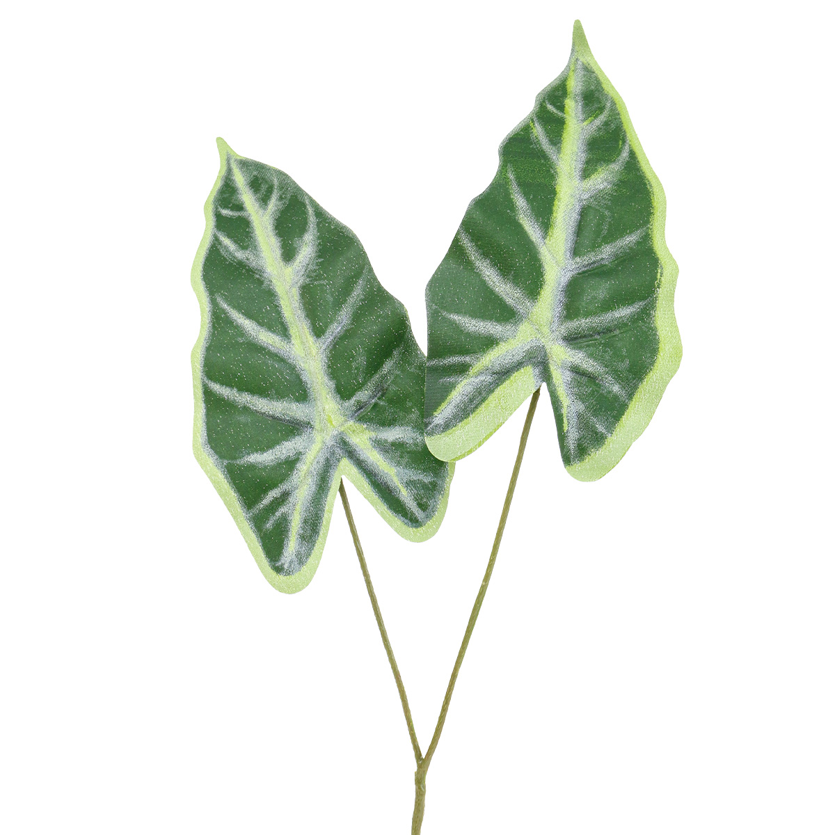 An den zwei künstlichen Trieben der grünen Kunstpflanze sitzt je eines dieser schmuckvollen Pfeilblätter. Ein hellgrüner breiter Rand zeichnet die Form der Blätter nach. Mit demselben Ton sind auch die Blattadern gestaltet, während tief dunkles Grün das Gewebe darstellt. Das Blatt ist aus dünnem Kunststoff gefertigt, was sich rau und weich anfühlt. Es sitzt auf den stabilen Blattadern aus Kunststoff auf der Rückseite.