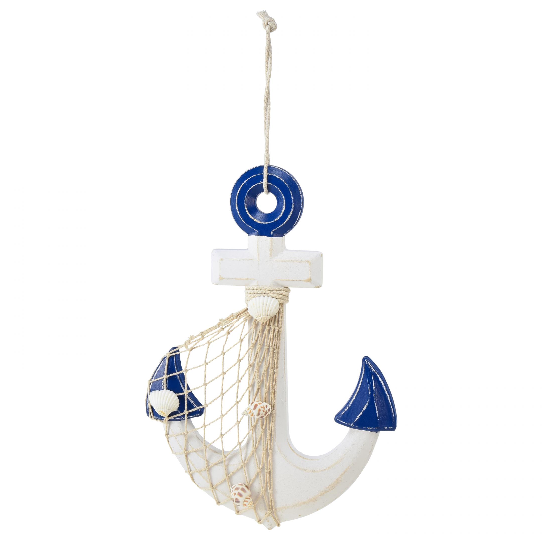 Die Anker-Deko zum Hängen kommt in maritimem Look, stilecht in Weiß und Blau. Passend dazu hat der Dekohänger ein Netz, das kleine Schnecken und Muscheln zieren.