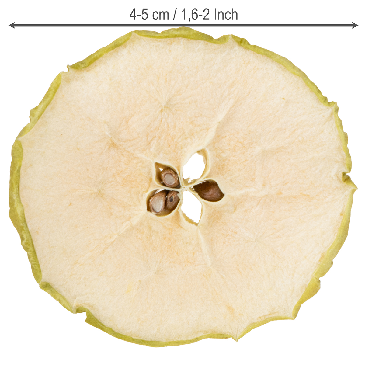 In jedem 500 Gramm Paket befinden mehrere rote Apfelscheiben zum Dekorieren, die alle naturbedingt leicht unterschiedliche Größen aufweisen. So haben die Scheiben Durchmesser von circa 4 bis 5 Zentimeter und sind als Dekoration auf dem Tischläufer am Esstisch eine außerordentliche Wirkung, die ihresgleichen sucht.