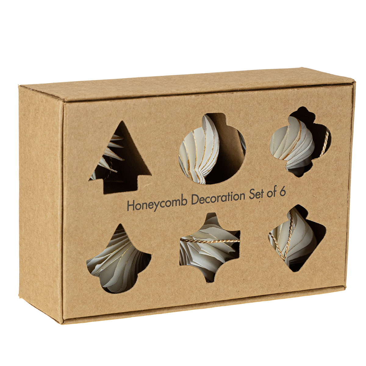 Holen Sie sich mit diesem Set eine vielseitige und umweltfreundliche Weihnachtsdekoration. Das Wabenpapier besticht durch seine robuste Verarbeitung und die leicht schimmernden Goldakzente. Ob klassischer Weihnachtsbaum, moderne Tischdeko oder dekorative Anhänger für Adventskränze – dieser Schmuck passt in jedes Ambiente.