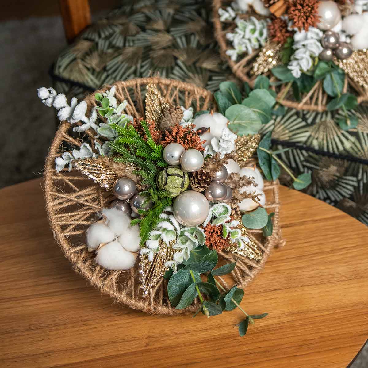 Materialien: Naturmaterialien wie Zapfen, Holz, Rinde, Moos, Zweige, Blätter, Trockenblumen, Seegras und Kokosfasern.