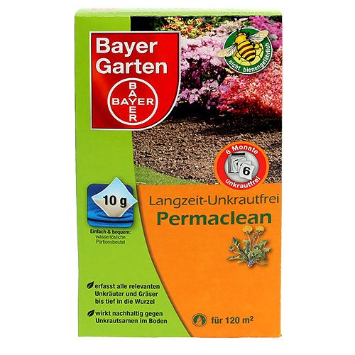 Verbannen Sie Unkräuter nachhaltig aus Ihrem Garten mit Bayer® Langzeit-Unkrautfrei Permaclean! Die besondere Wirkweise in 2 Stufen macht diesen Unkrautvernichter besonders effektiv: Zuerst werden unerwünschte Kräuter und Gräser angegriffen, indem er bis in die Wurzeln eindringt und das Unkraut im Nu zerstört. Danach verhindert das Unkrautmittel, dass neue Unkrautsamen keimen.Eine große Verpackung Bayer® Langzeit-Unkrautfrei Permaclean enthält 120 Gramm des Unkrautgiftes in 12 kleinen Päckchen zu je 10 Gramm. Die Anwendung ist denkbar einfach und bequem: Lösen Sie dafür ein Päckchen (10 Gramm) des Unkrautvernichters in 1 Liter Wasser auf und schon haben Sie eine Lösung, mit der Sie 10 Quadratmeter Boden behandeln können. Vernichten Sie vorhandenes Unkraut und schützen Sie Ihren Garten dauerhaft vor neuem Befall mit Bayer® Langzeit-Unkrautfrei Permaclean!