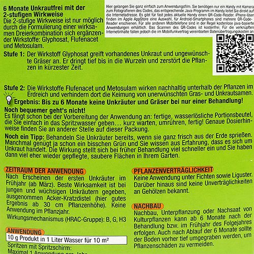 Eine große Verpackung Bayer® Langzeit-Unkrautfrei Permaclean enthält 120 Gramm des Unkrautgiftes in 12 kleinen Päckchen zu je 10 Gramm. Die Anwendung ist denkbar einfach und bequem: Lösen Sie dafür ein Päckchen (10 Gramm) des Unkrautvernichters in 1 Liter Wasser auf und schon haben Sie eine Lösung, mit der Sie 10 Quadratmeter Boden behandeln können. Vernichten Sie vorhandenes Unkraut und schützen Sie Ihren Garten dauerhaft vor neuem Befall mit Bayer® Langzeit-Unkrautfrei Permaclean!
