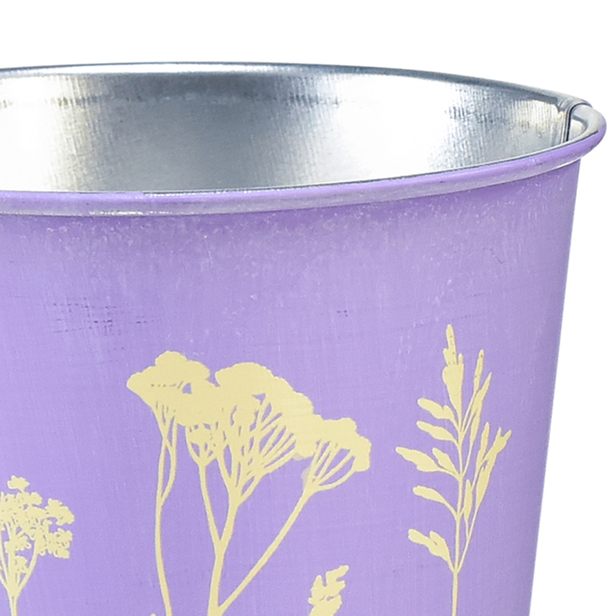 Setzen Sie einen Pflanztopf in den Übertopf aus Metall und geben Sie Margeriten und anderen Wiesenblumen mit dem Blumentopf ein neues Zuhause. Der Übertopf aus Metall ist einseitig mit dem Blumen-Motiv in Gelb verziert, was die Farbe auf dem lavendelfarbenen Topf wie mattes Goldgelb schimmern lässt.