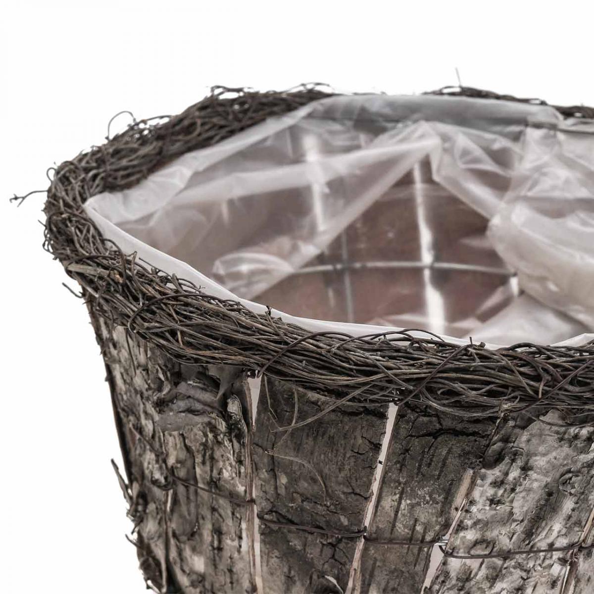 Das Pflanzgefäß besteht aus einem Metallkorb, um welchen rundherum Stücke aus Baumrinde und geflochtene Reben gewunden sind. Der Blumentopf ist mit Kunststofffolie ausgekleidet, sodass Sie ihn sogleich bepflanzen können.