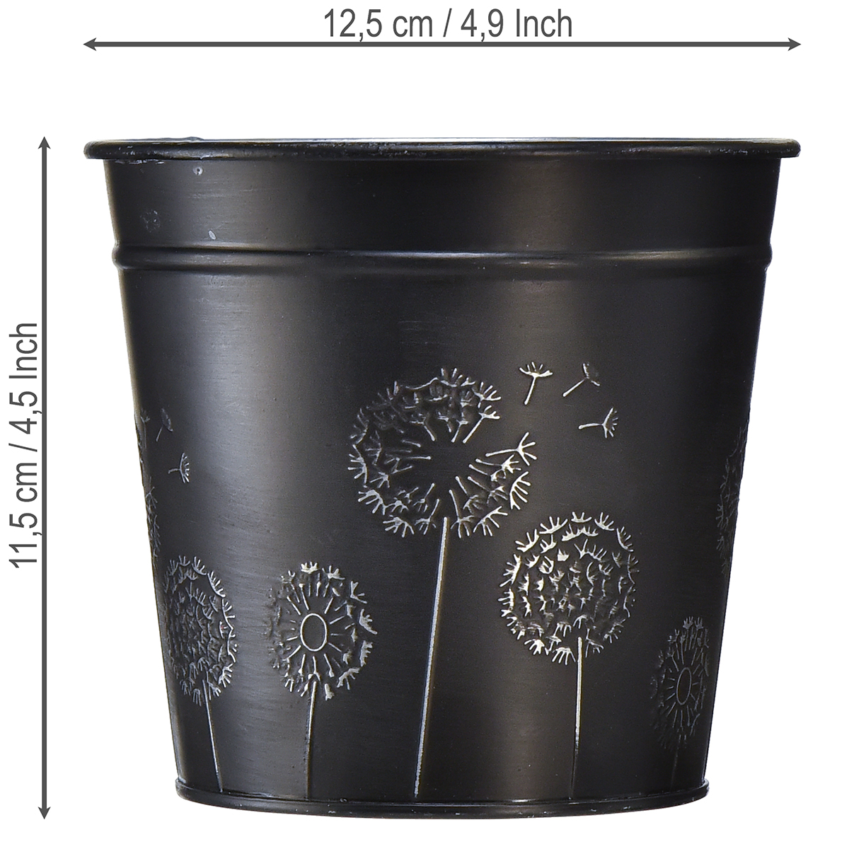 Dieser Blumentopf in Schwarz ist mit einem silberfarbenen Dekor versehen, das Lust auf den Sommer macht. Pusteblumen zeigen sich in verschiedenen Größen und Stadien. Und einige Schirmchen fliegen bereits los in neue Gefilde.