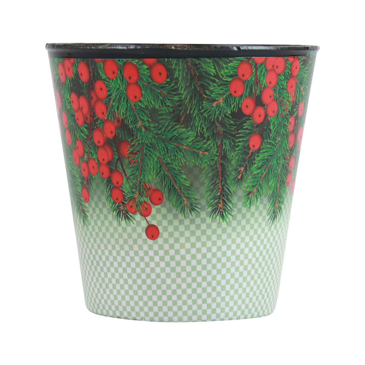 Dieser Blumentopf für Weihnachten ist mit reichlich roten Beeren und grünen Nadelzweigen ein echter Blickfang. Verschönern Sie Topfpflanzen und Gestecke durch den kleinen Übertopf mit dem Ilex-Motiv.Der Blumentopf, aus robustem Kunststoff gefertigt, bietet eine Fülle von kreativen Gestaltungsmöglichkeiten, um weihnachtliche Gestecke in Rot und Grün zu kreieren. Er ist mit dem Motiv eines grünen Ilex-Zweigs, übersät mit roten Beeren, verziert. Nach unten hin geht die bedruckte Folie in ein charmantes grün-weißes Schachbrettmuster über. Die Innenseite des Übertopfs hingegen ist in Schwarz gehalten.