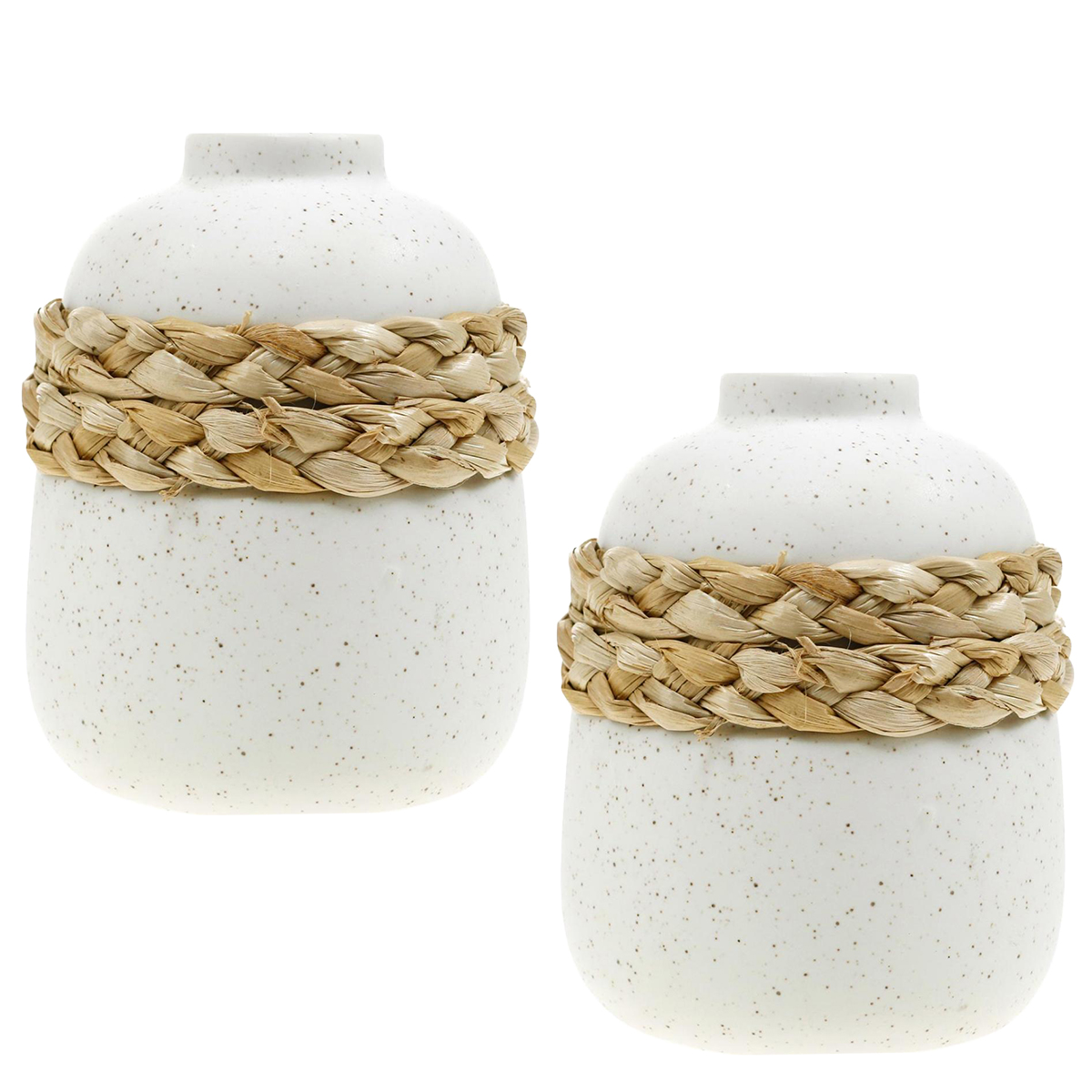 Entdecken Sie die einzigartige Mischung aus Keramik und Seegras mit dieser charmanten Tischvase. Perfekt für Floristen und Blumengeschäfte, eignet sich diese Vase bestens für die Inszenierung von künstlichen Blumenarrangements. Die cremeweiße Glasur mit kaffeebraunen Einsprengseln in Kombination mit geflochtenen Seegrasbändern verleiht jedem Raum ein besonderes Flair.