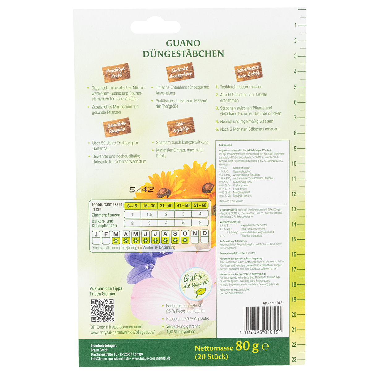 Die Dünger-Stäbchen lassen sich über mehrere Wachstumsphasen hinweg effizient verwenden, da sie lange haltbar und einfach portionierbar sind. Sie eignen sich hervorragend für thematische Verkaufsflächen in Bau- und Gartenmärkten sowie für den Vertrieb in Großhandelsmärkten. Dank ihrer kompakten Verpackung können sie platzsparend gelagert werden. Als Impulsartikel zu saisonalen Pflanzen sind sie ideal für Zusatzverkäufe.
