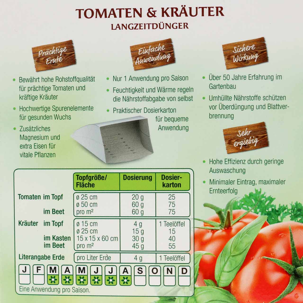 Und das Ganze mit nur einer Anwendung pro Saison, was den Spezialdünger besonders bequem und preiswert macht! Auch ist der Tomatendünger so konzipiert, dass Sie mit ihm nicht versehentlich eine Überdüngung und damit eine Blattverbrennung hervorrufen. Gerade als Dünger für Pflanzen in Töpfen und Kübeln eignet sich das Granulat hervorragend! Die genaue Dosieranleitung entnehmen Sie einfach der Rückseite der Packung.