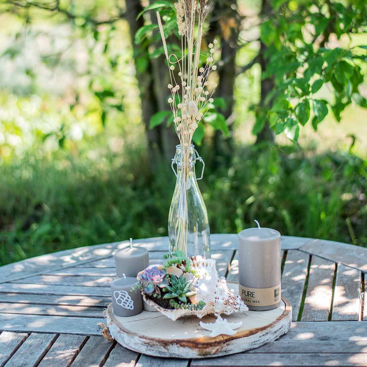 Dekorieren Sie beispielsweise eine Sommerhochzeit mit beleuchteten Dekoflaschen: Befüllen Sie ein paar Bügelflaschen mit Perlendraht und Schleierkraut. Setzen Sie eine Lichterkette ein oder Kerzen auf den Flaschenhals. Weitere Glasflaschen befüllen Sie mit Wasser und stellen kleine Sträußchen hinein. Verteilen Sie die Kerzenhalter und Glasvasen im Wechsel auf der Festtafel, kombinieren Sie dabei auch Flaschen in anderen Größen und weitere Glasgefäße wie Windlichter oder Glasübertöpfe.