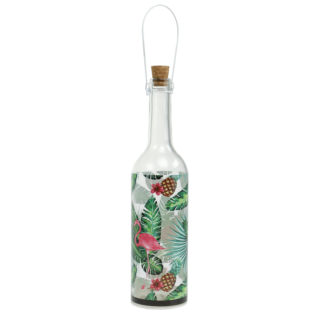 Die Deko-Flasche mit LEDs in Warmweiß und Flamingo Motiv wird als 2er-Set geliefert. Mit dem Henkel hat jede Lampe eine Gesamthöhe von ungefähr 37,5 Zentimetern, wobei die Flaschen selbst ungefähr 28,5 Zentimeter hoch ist und einen Durchmesser von circa 7,3 Zentimetern besitzt.