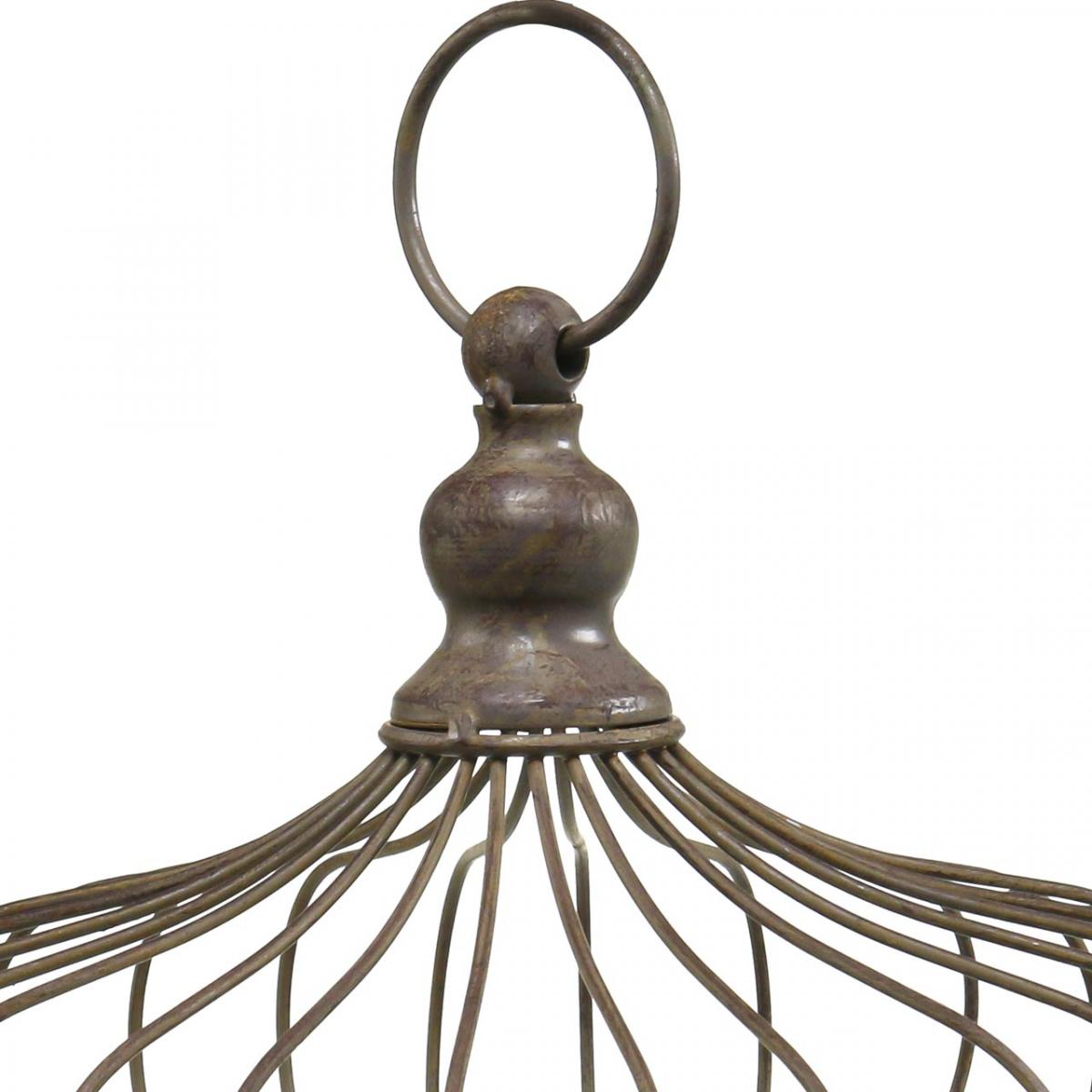 Bereits inklusive ist der Ring als Halterung, der locker in der Öse liegt. Mit Ring ist die Deko-Krone ca. 26 Zentimeter hoch. Bauchig, voluminös ist dagegen der Korpus. Der setzt sich aus 24 geschwungenen Streben zusammen, die ihren Halt am Rand der kreisrunden Öffnung finden.