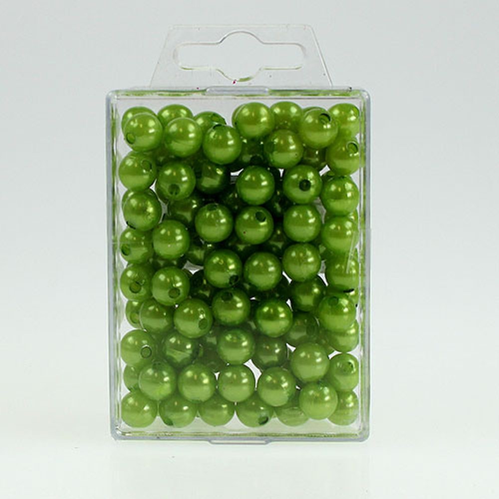 Die Deko-Perlen in Grün erhalten Sie zu 115 Stück in einer leicht verstaubaren Kunststoff-Box. Jede Perle misst im Durchmesser etwa 10 Millimeter; der Durchmesser der Löcher beträgt circa 3 Millimeter.