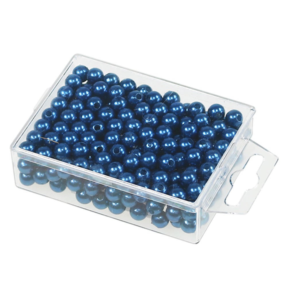 Die Deko-Perlen in Blau werden in einer Plastikbox zu 250 Stück angeboten. Der Durchmesser beträgt ungefähr 8 Millimeter, während der Öffnungsdurchmesser circa 2 Millimeter beträgt.
