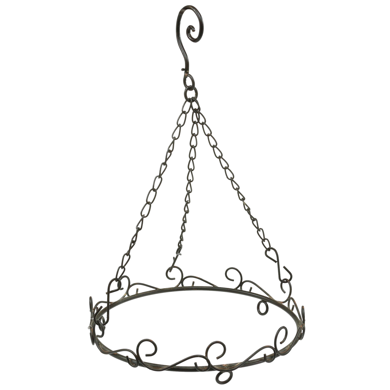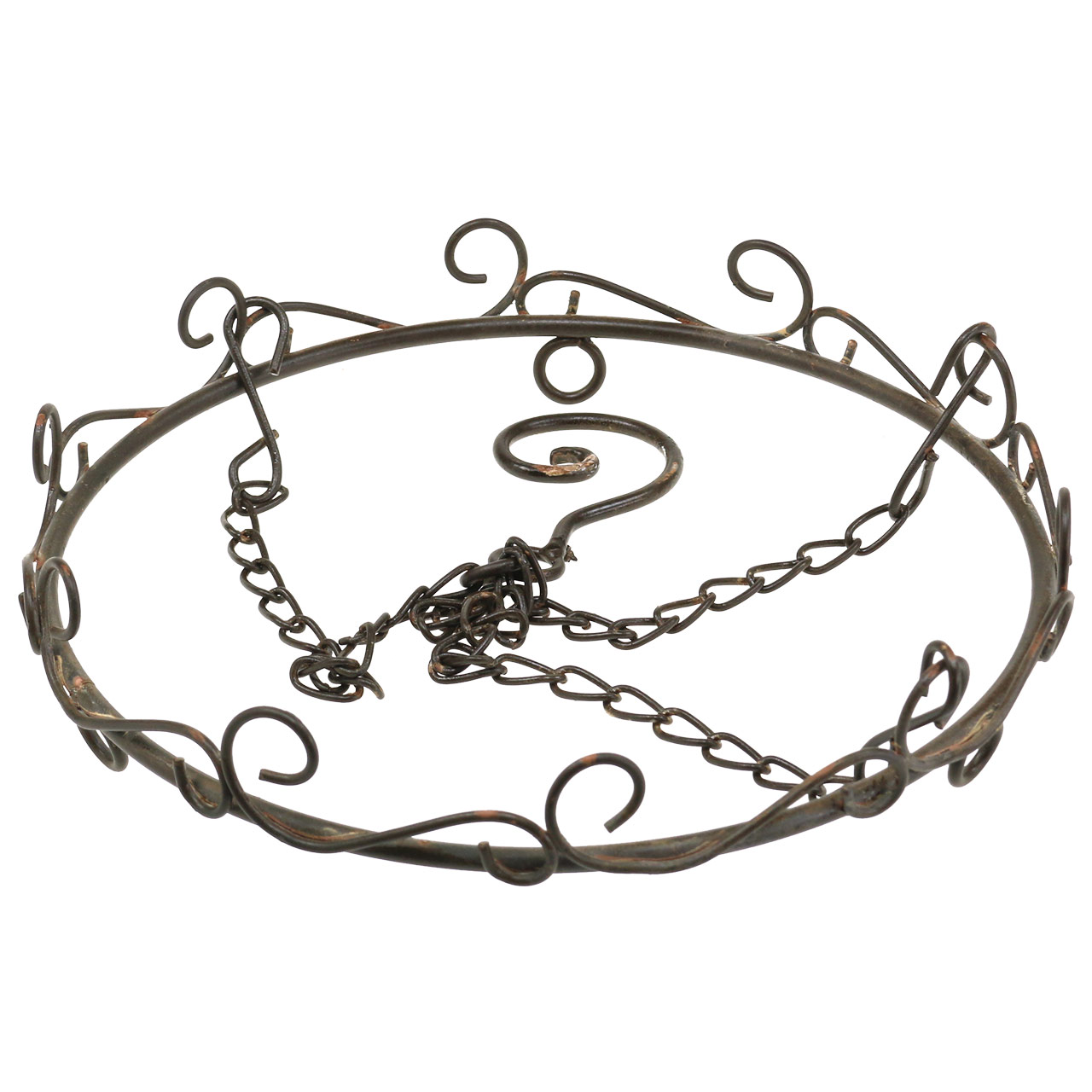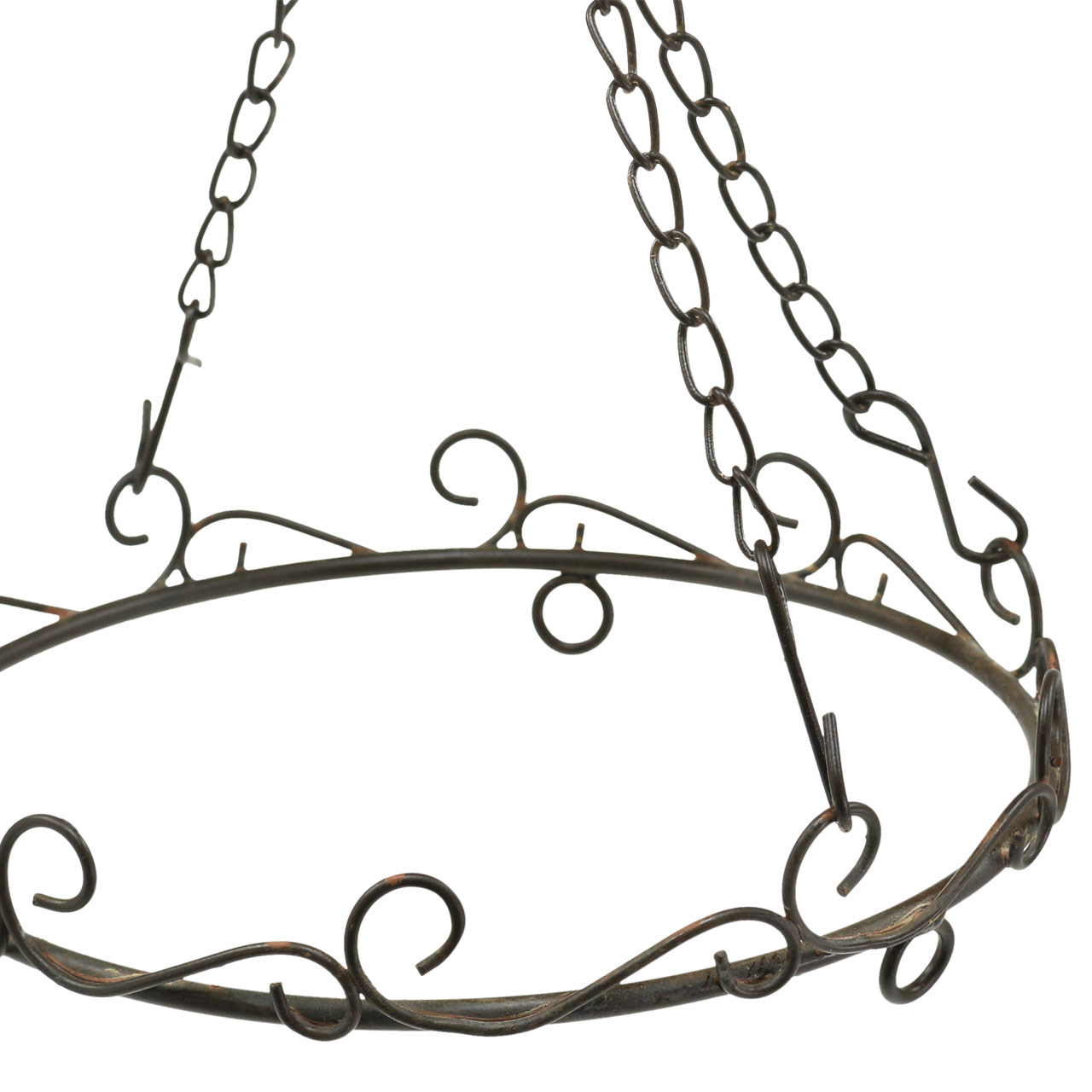 Der Dekoring mit Haken zum Hängen in ist Dunkelbraun und weist an den Verbindungen jeweils dekorative Rost-Flecken auf, was den antiken Vintage-Look des hübschen Metall-Rings noch verstärkt. Zum Dekoring gehört ein großer ebenfalls floral geschwungener großer Haken zum Aufhängen des Metall-Rings. Am Haken befinden drei etwa 22 Zentimeter lange Metallketten mit S-Haken, die an den drei Ösen des Metallrings eingehängt werden können.