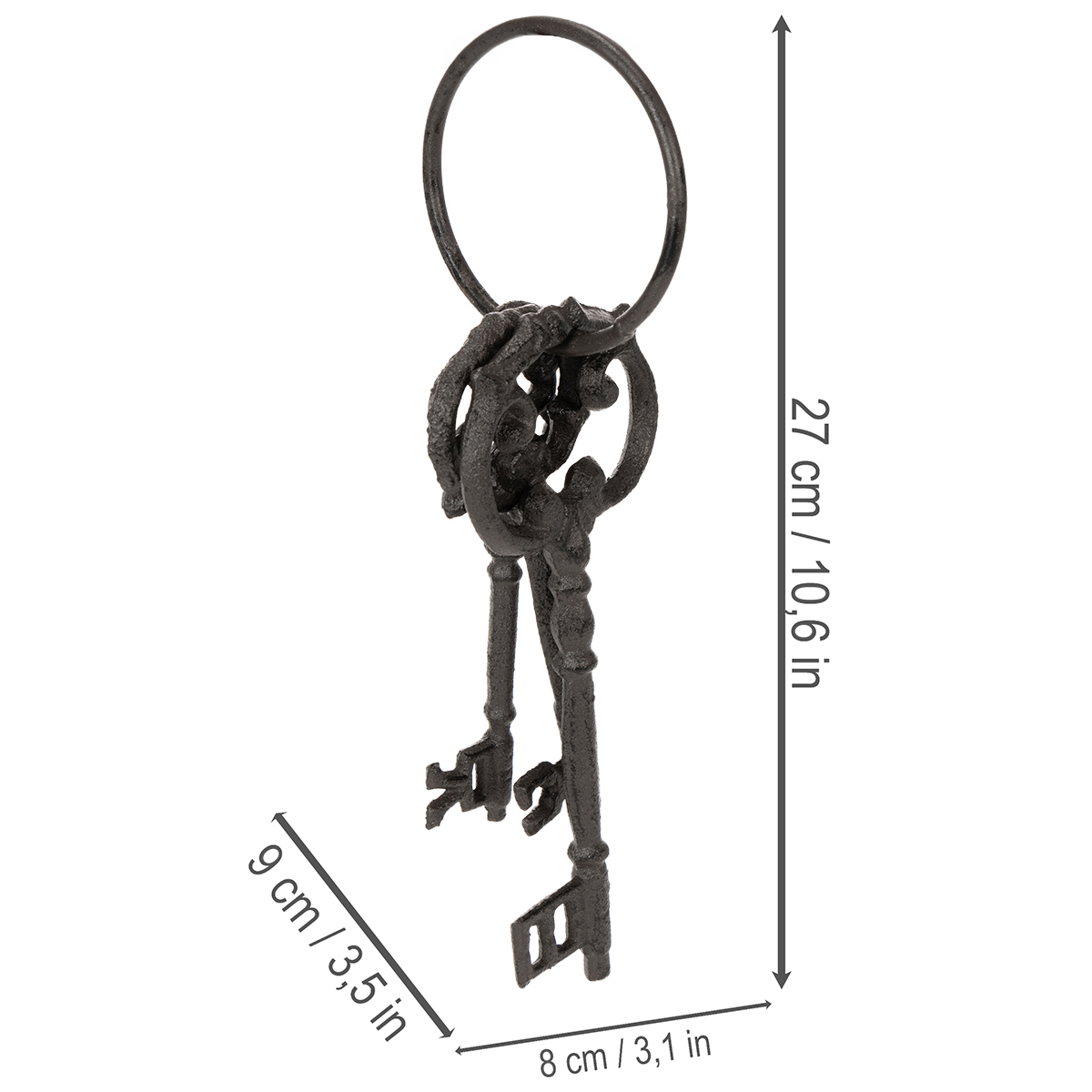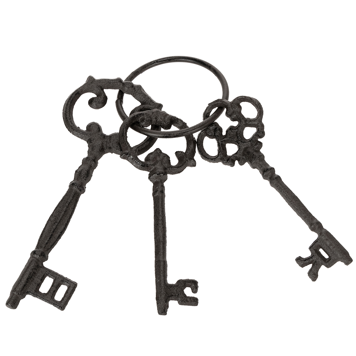 Verleihen Sie Ihren Dekorationsideen einen nostalgischen Touch mit diesem einzigartigen Deko-Schlüsselring aus robustem Gusseisen. Drei kunstvoll gestaltete antike Schlüssel an einem Ring bringen rustikale Eleganz in jeden Raum und machen Ihre Kreationen unverwechselbar.