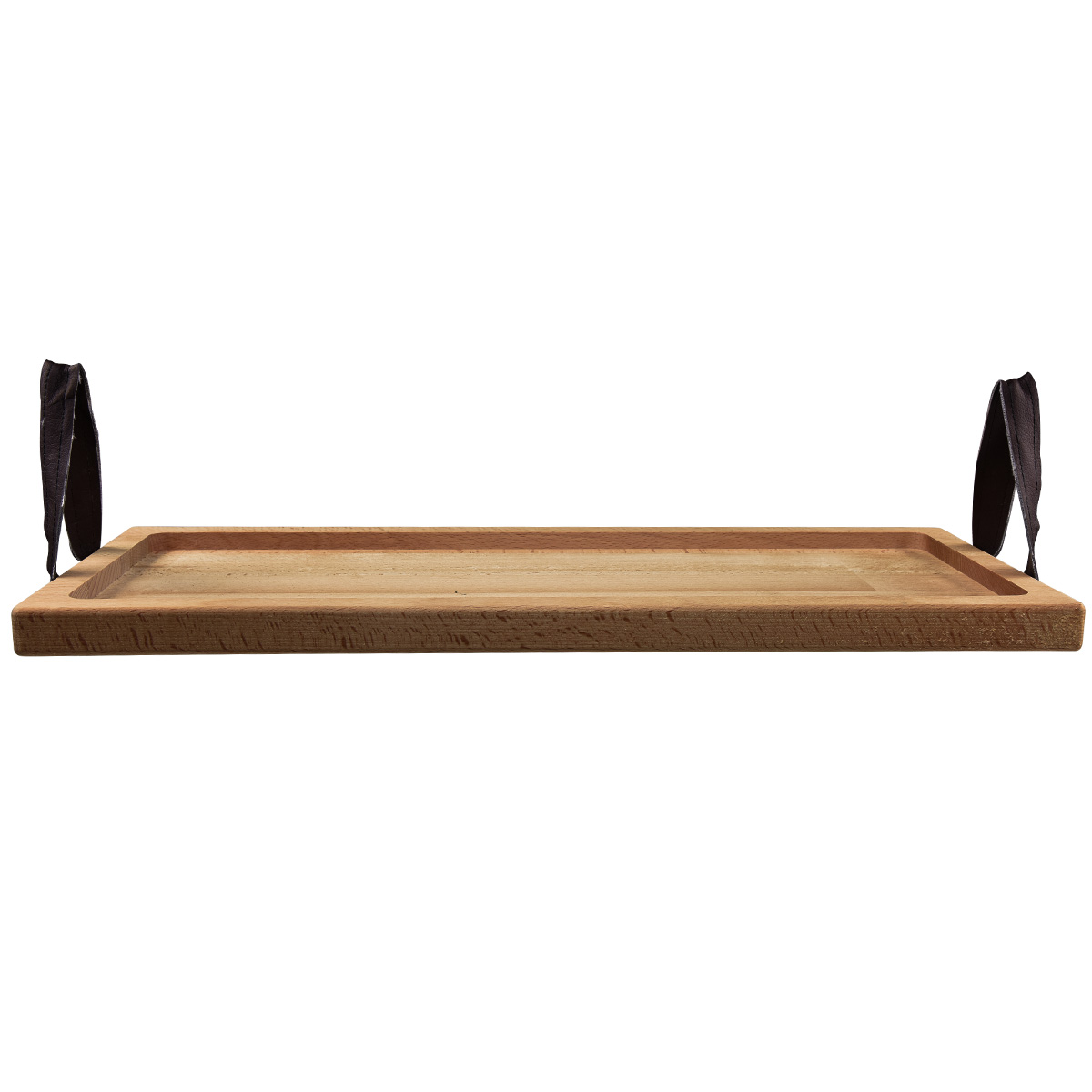 Das Deko-Tablett besteht aus fein lasiertem echtem Buchenholz mit FSC-Label, hat leicht abgerundete Ecken und einen erhöhten Rand. Der Clou an diesem Holztablett sind schließlich die Griffe aus dunkelbraunem Kunstleder. Mit einem Seil ließe sich das Dekotablett sogar daran aufhängen, um Accessoires und kleine Pflanzen schwebend zu präsentieren.
