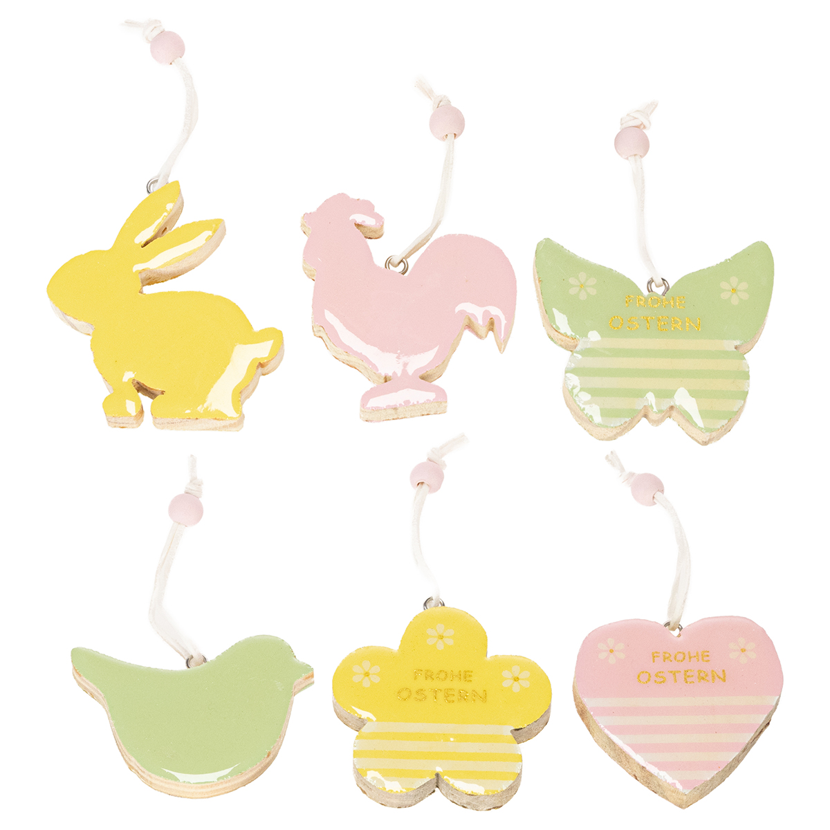 Diese Holzanhänger für die Osterdekoration sind vielseitige, nachhaltige und handliche Elemente zur Gestaltung von Sträußen, Kränzen und anderen Dekorationen. Sie bestehen aus robustem Holz und sind beidseitig in pastelligen Farben beschichtet. Die Sets enthalten sechs verschiedene Formen: Hase, Hahn, Vogel, Schmetterling, Blüte und Herz, jeweils in ansprechenden Farbtönen wie Gelb, Rosa und Grün. Die Anhänger sind mit einer weißen Kordel und einer rosa Holzperle versehen, wodurch sie einfach aufzuhängen sind.