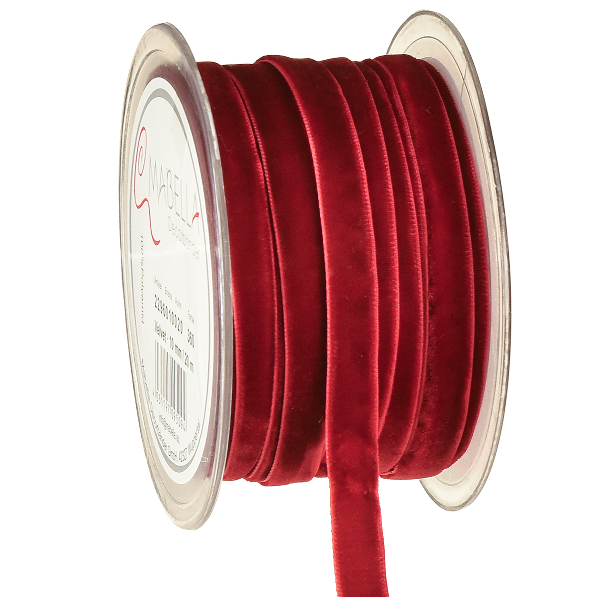 Das bordeauxrote Dekoband besteht aus weichem Samt und ist mit einer kleinen Nadel auf einer Kunststoffspule befestigt. Die Gesamtlänge des Bandes beträgt circa 20 Meter und die Breite in etwa 10 Millimeter.