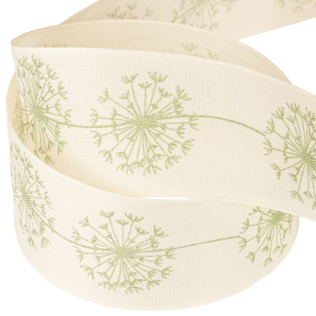 Entdecken Sie ein vielseitiges Dekoband, das jedem Anlass eine besondere Note verleiht. Das Pusteblumenmuster in zarten Grüntönen auf cremefarbenem Hintergrund sorgt für einen frischen und dennoch zeitlosen Look. Perfekt für kreative Projekte, die Eleganz und Stil miteinander verbinden.