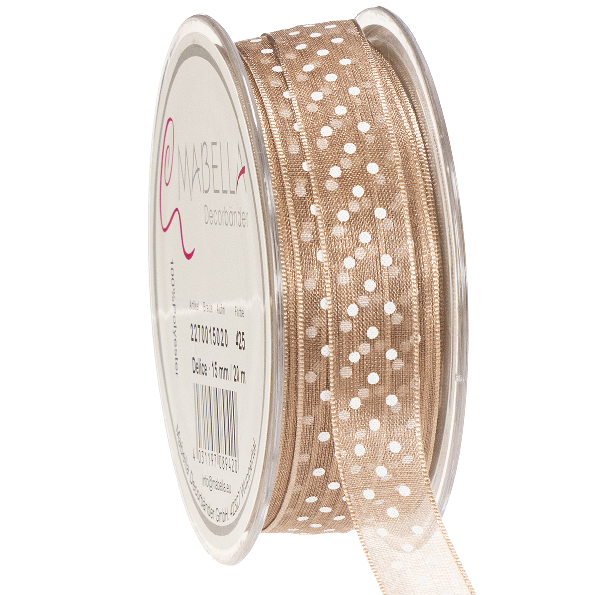 Produktname: Geschenkband Braun mit weißen Punkten 1cm x 20m für kreative Dekoration und stilvolle Verpackungen
