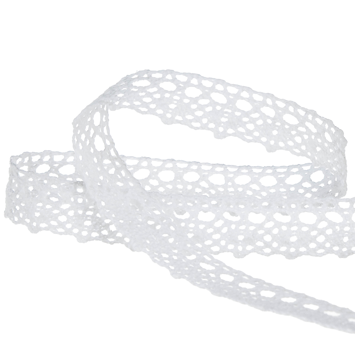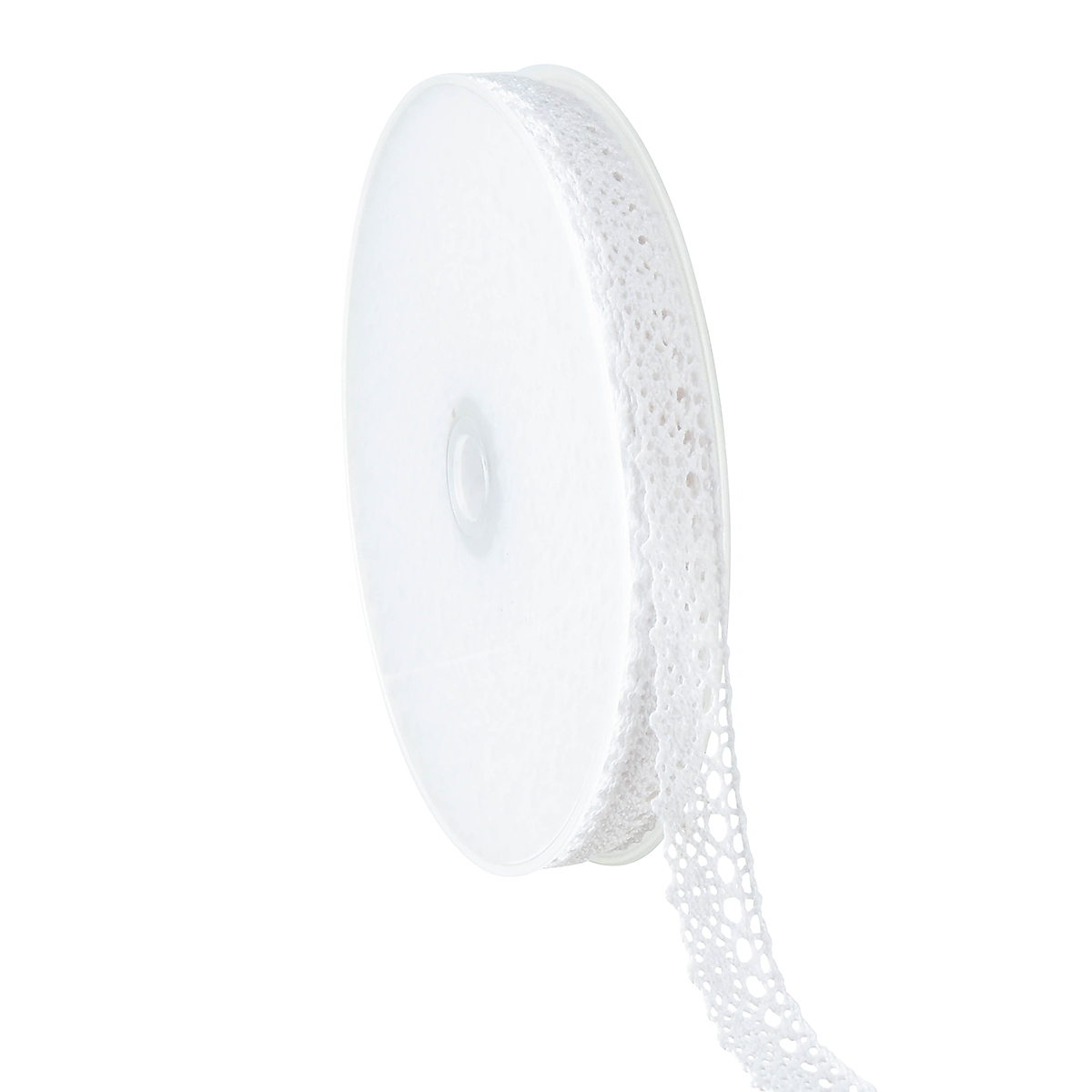 Das Spitzen-Dekoband in Weiß misst in der Breite etwa 16 Millimeter und in der Länge ungefähr 20 Meter. Es ist mit einer dünnen, silbernen Metallnadel auf einer flachen Kunststoff-Spule festgesteckt.