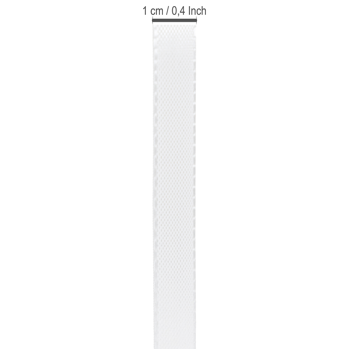 Das Dekorationsband in Weiß ist auf eine Rolle aus Kunststoff aufgewickelt und hat eine Länge von insgesamt 50 Metern bei einer Breite von 10 Millimetern.