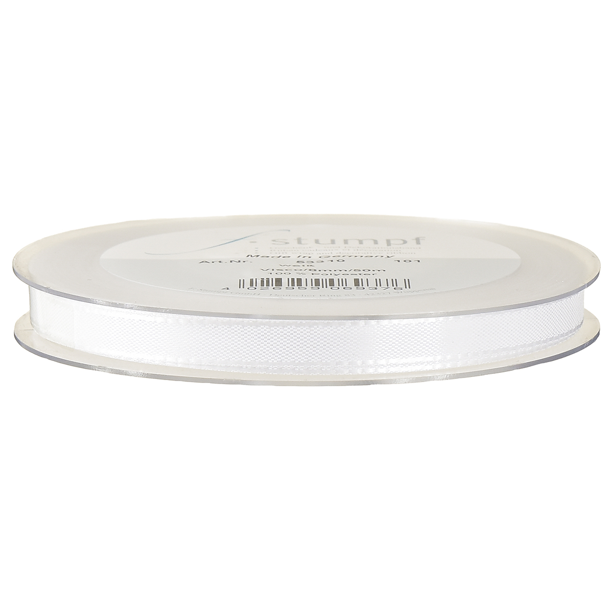 Das Dekorationsband in Weiß ist auf eine Rolle aus Kunststoff aufgewickelt und hat eine Länge von insgesamt 50 Metern bei einer Breite von 8 Millimetern.