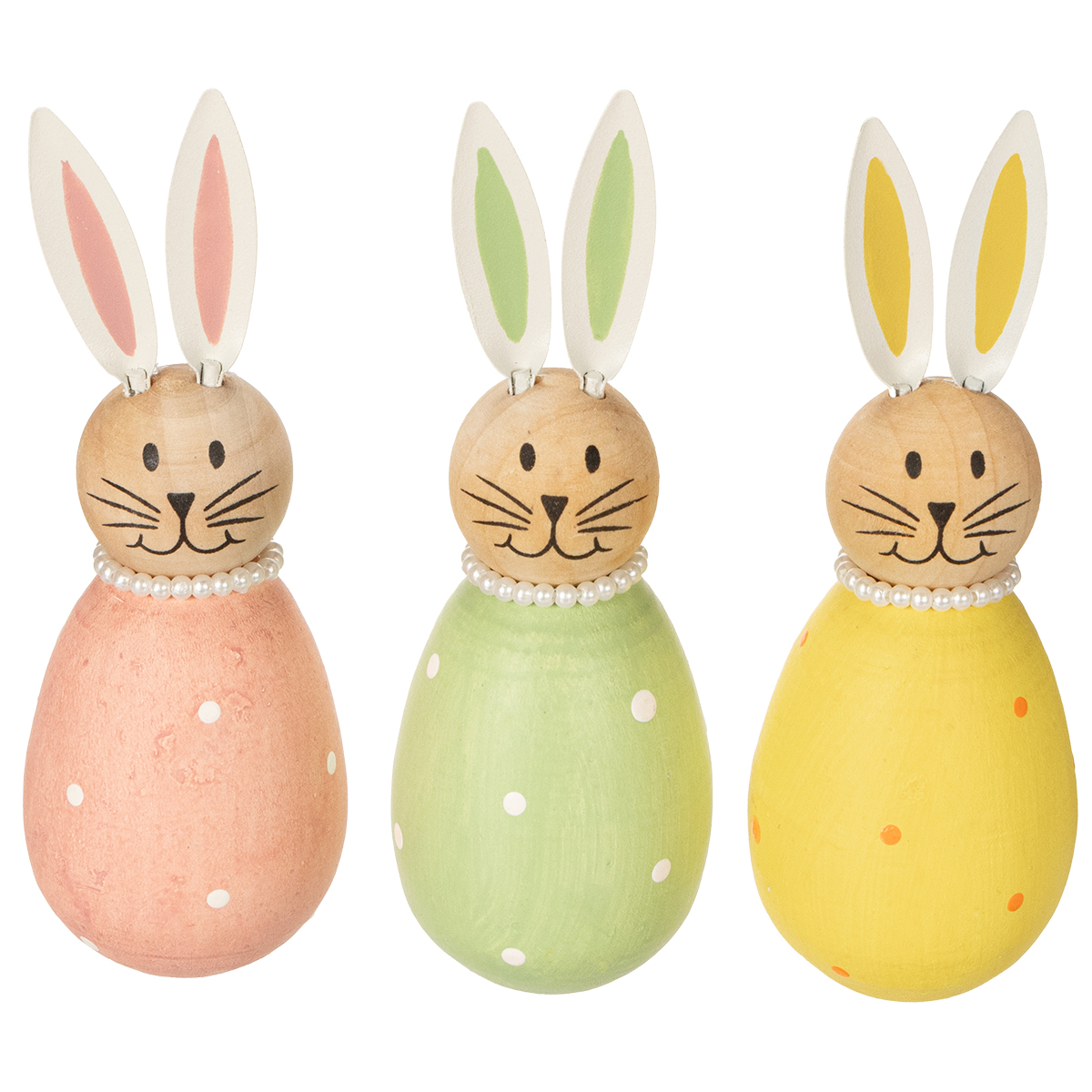 Produktname: Dekorative Hasenfiguren aus Holz im Ei-Look, 12 cm, frühlingshafte Tischdeko, 3er-Set