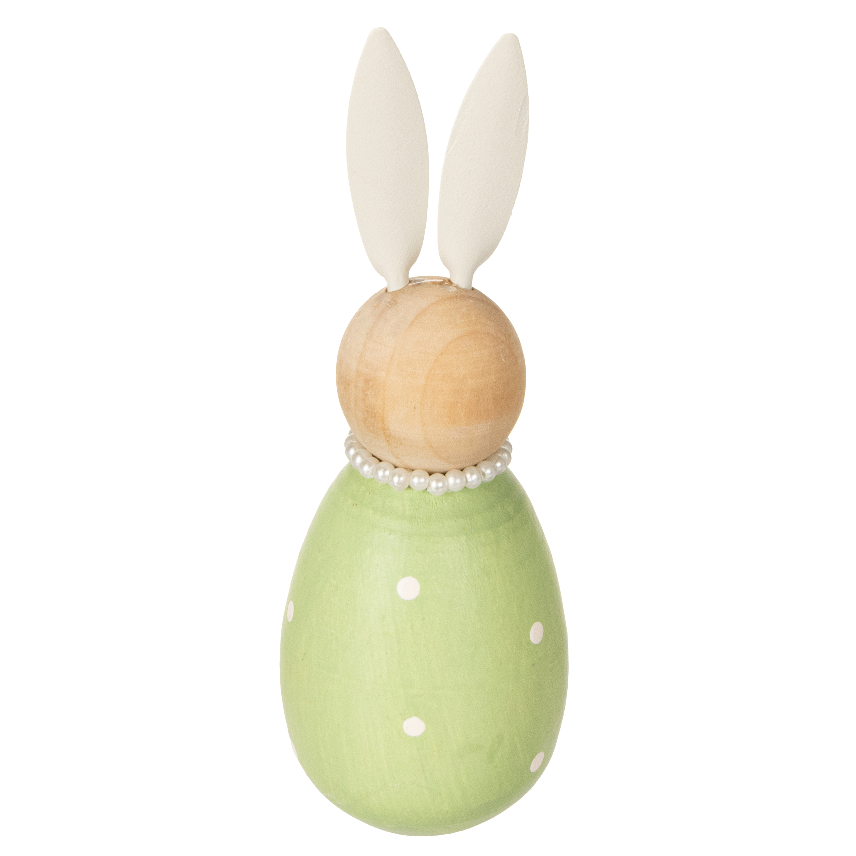 Diese detailverliebten Hasenfiguren überzeugen durch ihr liebevoll gestaltetes Design und die harmonische Kombination von Farben und Materialien. Mit ihren zarten Pastelltönen in Rosa, Gelb und Grün fügen sich die Figuren optimal in eine Deko im Vintage- oder Landhausstil ein. Die eierförmigen Körper aus Holz sind mit feinen Punkten verziert und stehen aufrecht, während die beweglichen Ohren aus Metall und die filigranen Perlenketten Eleganz und Raffinesse hinzufügen.