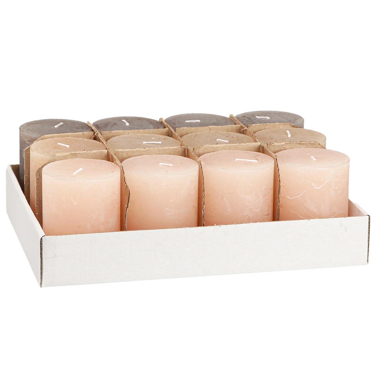 Produktname: Stumpenkerzen Set 3 Farben Braun, Apricot, Sand 60x80mm 12 Stück, Rustikale Deko, Lange Brenndauer