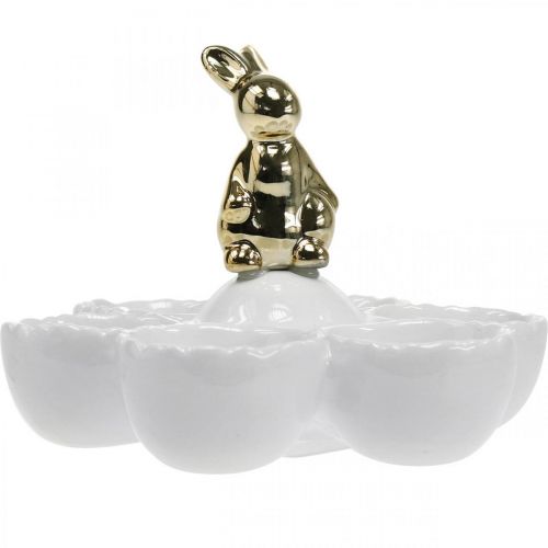 Ganze sechs Deko-Eierbecher bewacht der kleine goldfarbene Osterhase auf dieser Eierplatte aus cremeweißer Keramik. Passend zum Osterfest sind die Eierbecher als Osterschalen gestaltet.Mit abgerundeten kleinen Sägezähnen zeigen sich die Schalenränder. Fast könnte man meinen, sie wären gerade erst von ihren frisch geschlüpften Küken verlassen worden. Mittig, wie auf einem Ei sitzend, thront der goldene Osterhase in dieser festlichen Tischdeko. Die sechs Eierbecher reihen sich wie eine Blume um den Oster-Hasen herum an.