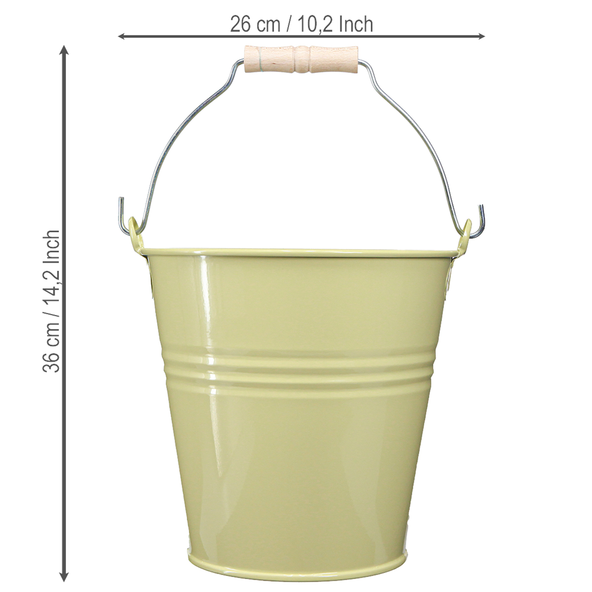 Unser dekorativer Metalleimer begeistert mit einem beweglichen Henkel und einem komfortablen Holzgriff. Die feinen Zierrillen verleihen ihm eine nostalgische Note, die sich wunderbar mit Naturmaterialien und rustikalen Möbeln kombinieren lässt. Seine Vielseitigkeit ermöglicht, ihn als Blumentopf, Pflanzkübel, Übertopf oder zur Aufbewahrung zu nutzen.