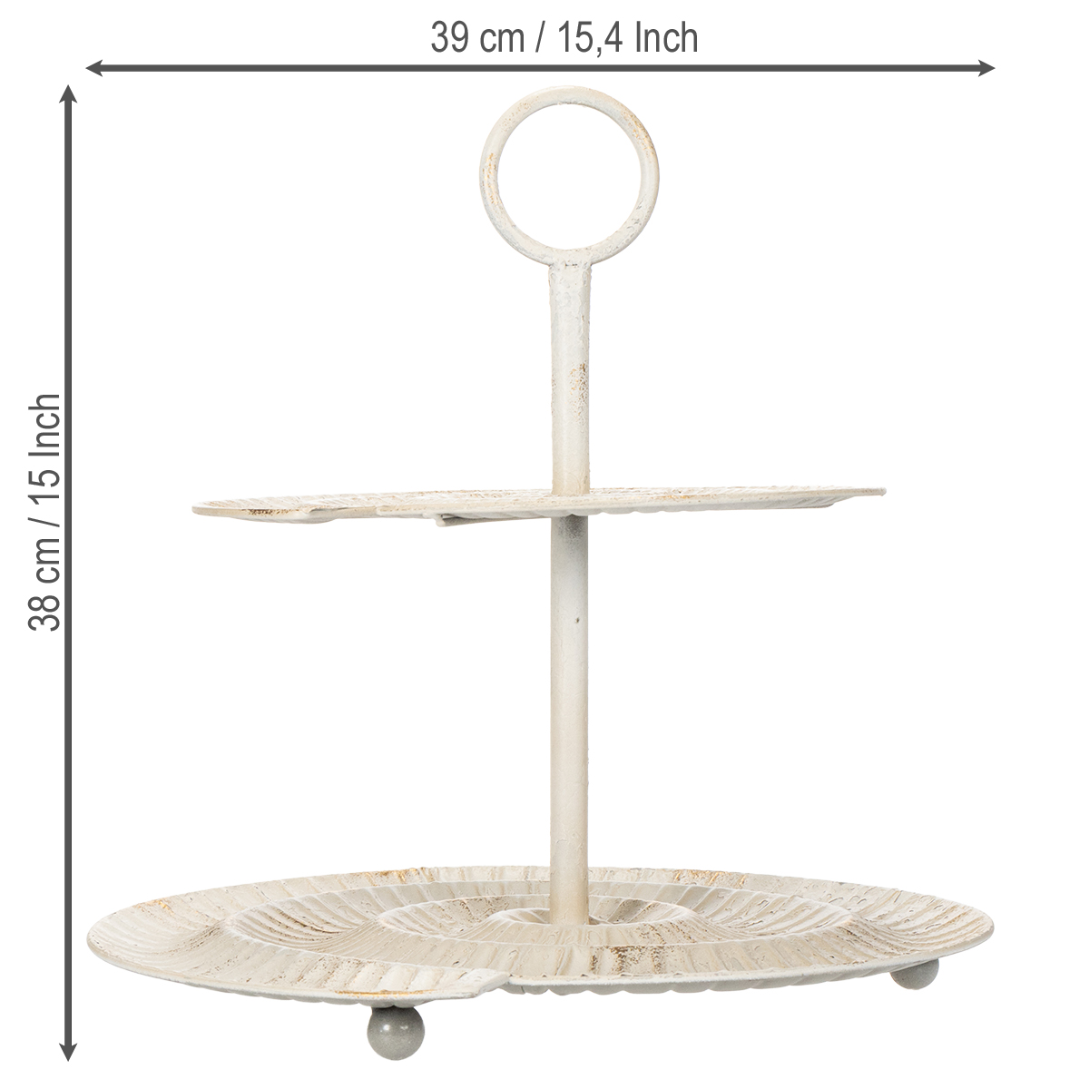Mit großzügigen Maßen von 39 cm Durchmesser und einer Höhe von 38 cm bietet die Etagere ausreichend Platz für eine vielfältige Nutzung. Kombinieren Sie sie mühelos mit anderen Vintage-Elementen wie pastellfarbenen Vasen, Spitzenläufern oder künstlichen Blumenarrangements – so gestalten Sie ein harmonisches Ambiente.
