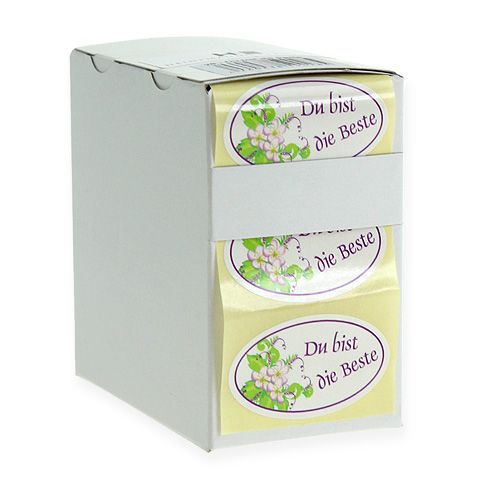 Die weißen, ovalen Etiketten sind mit der Aufschrift „Du bist die Beste“ sowie einem Blumenmotiv bedruckt und werden zu 250 Stück im praktischen Spender angeboten. Bei Bedarf können Sie also ganz einfach einen Aufkleber vom Band abziehen. Jedes Etikett ist circa 5 x 3 Zentimeter groß.