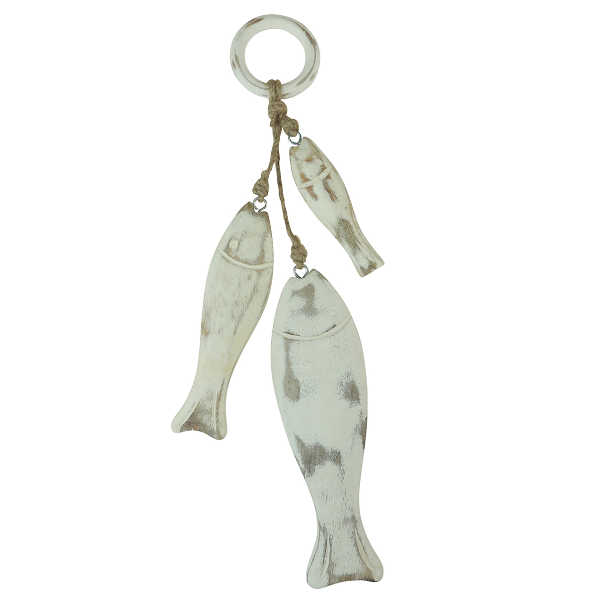 Aus massivem Holz geschnitzt, sind die Fische unterschiedlich groß und bilden so ein dekoratives Trio an einer dicken Kordel aus Naturfaser.