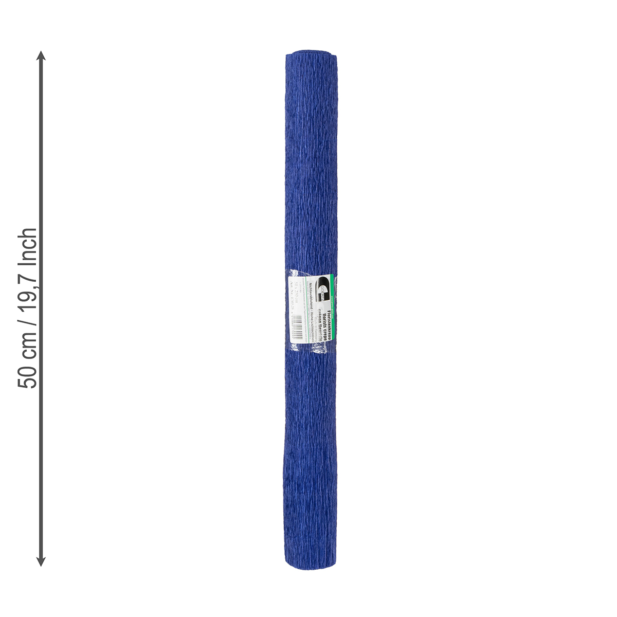 Das Floristen-Krepppapier in Dunkelblau ist zu einer Rolle aufgewickelt, welche circa 160 Gramm wiegt. Es misst im ausgerollten Zustand ungefähr 50 x 250 Zentimeter.