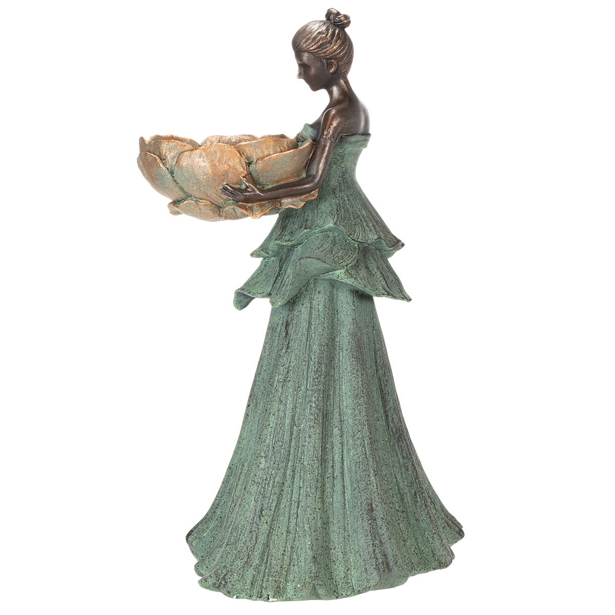 Die Frauenstatue kombiniert zeitlose Schönheit mit praktischer Vielseitigkeit. Die naturgetreue Gestaltung im Kolonialstil umfasst grüne und bronzene Farbtöne und lässt sich ideal mit anderen Elementen wie Kerzenleuchtern oder Deko-Vasen kombinieren. Dank des robusten Polyresin-Materials ist sie wetterbeständig und sowohl für den Innen- als auch Außenbereich geeignet.