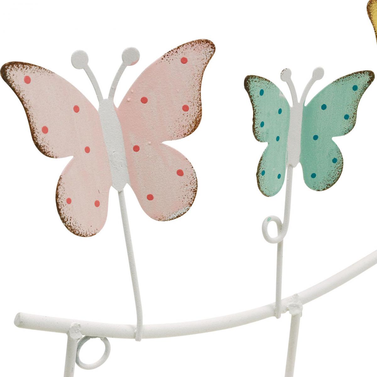 Die Metalldeko besteht aus einem geschwungenen Quersteg mit fünf gebogenen Haken in Weiß. An der Oberseite sind sieben verschiedenfarbige Deko-Schmetterlinge befestigt. Die Metallschmetterlinge haben einen weißen Körper und die Flügel sind jeweils Rosa mit Pinken Punkten, Hellblau mit türkisem Punktmuster, Gelb mit orangenen Punkten sowie Grün mit weißem Muster. Am Rand sind die Deko-Schmetterlinge dekorativ leicht mit etwas Edelrost überzogen.
