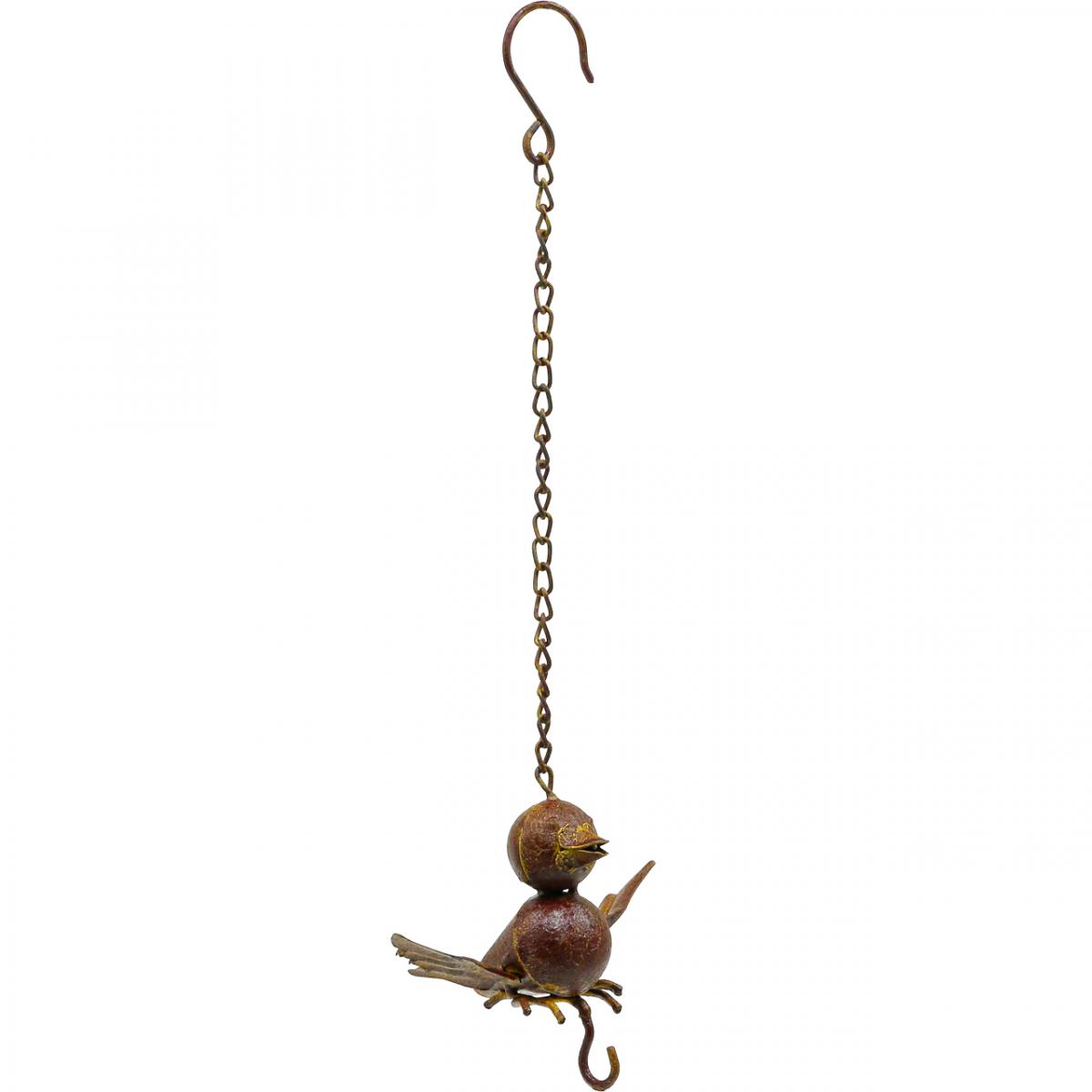 Der wetterfeste Vogel mit Haken besteht aus Metall in trendigem Edelrost-Look und stellenweise gelber künstlicher Patina. Der Metallvogel für den Garten setzt sich aus einer Vogelfigur, einer Kette zum Aufhängen und einem kleinen Haken an der Unterseite der Vogel-Deko zusammen.