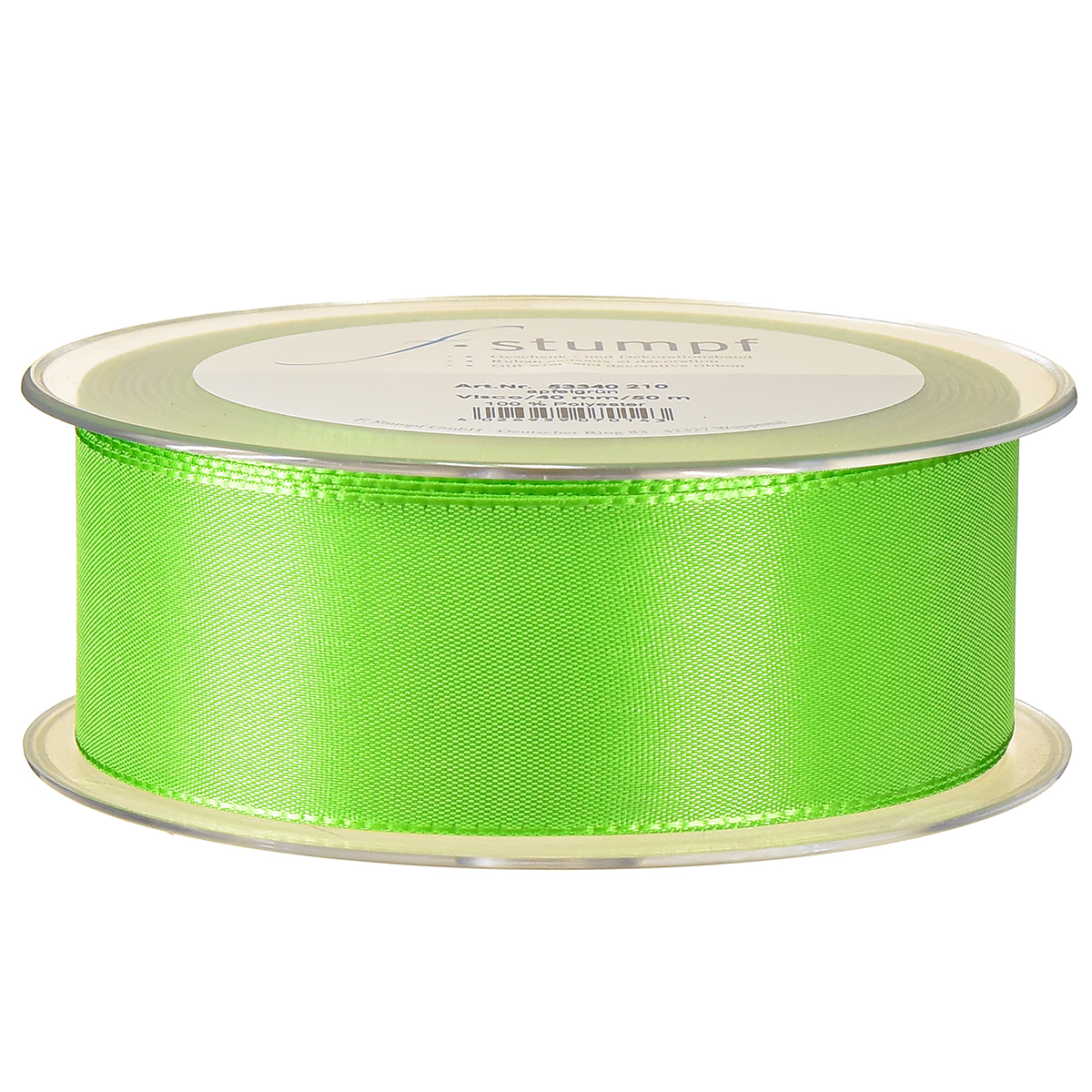 Das Geschenk- beziehungsweise Dekorationsband in Hellgrün ist circa 40 Millimeter breit und ungefähr 50 Meter lang. Es wurde zu 100% aus Polyester gefertigt.