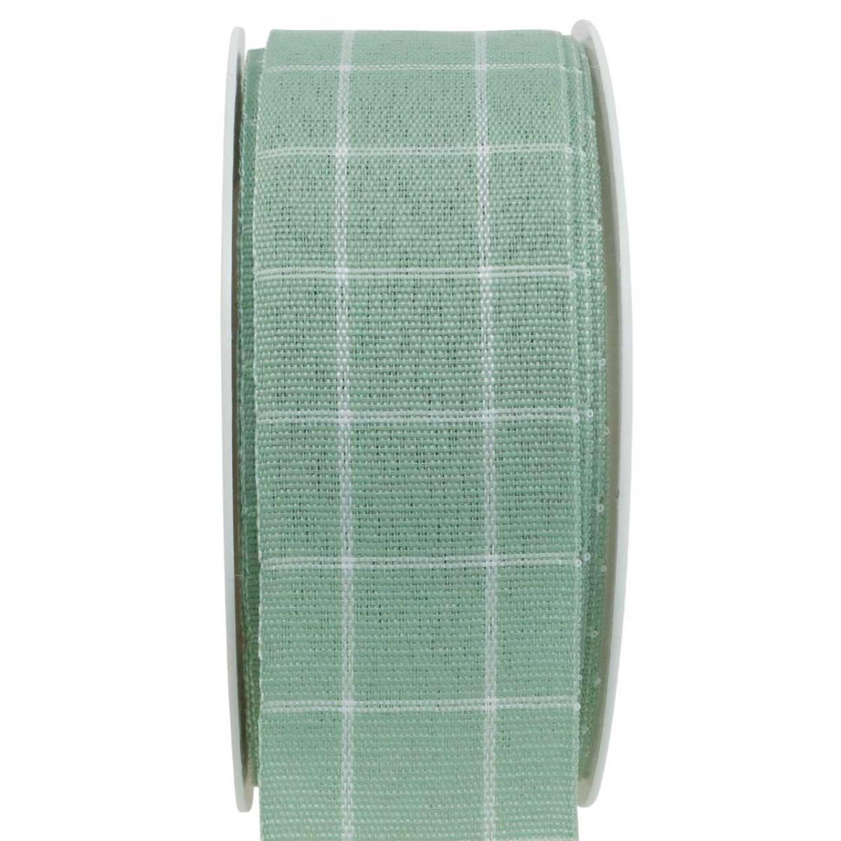 Das pastellgrüne, breite Dekoband ist mit einem weißen Karomuster verziert. Das Gewebe ist noch sichtbar, was dem Geschenkband einen leicht rustikalen Touch verleiht. Dennoch wirkt das Band durch seine dezente Farbe sehr exklusiv.