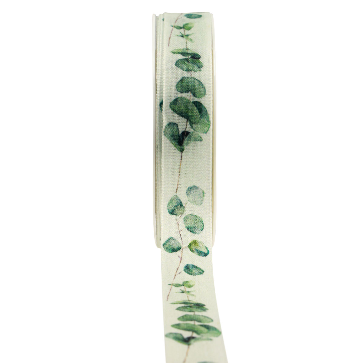 Durch das Eukalyptus-Muster macht sich dieses Geschenkband wunderschön zu Trockensträußen mit Eukalyptus oder anderen grünen Pflanzen. Oder benutzen Sie es als Dekoband für einen Loop oder Kranz mit konserviertem oder künstlichem Eukalyptus! Auch in Gestecken lässt sich das Band wunderbar vielseitig einsetzen.