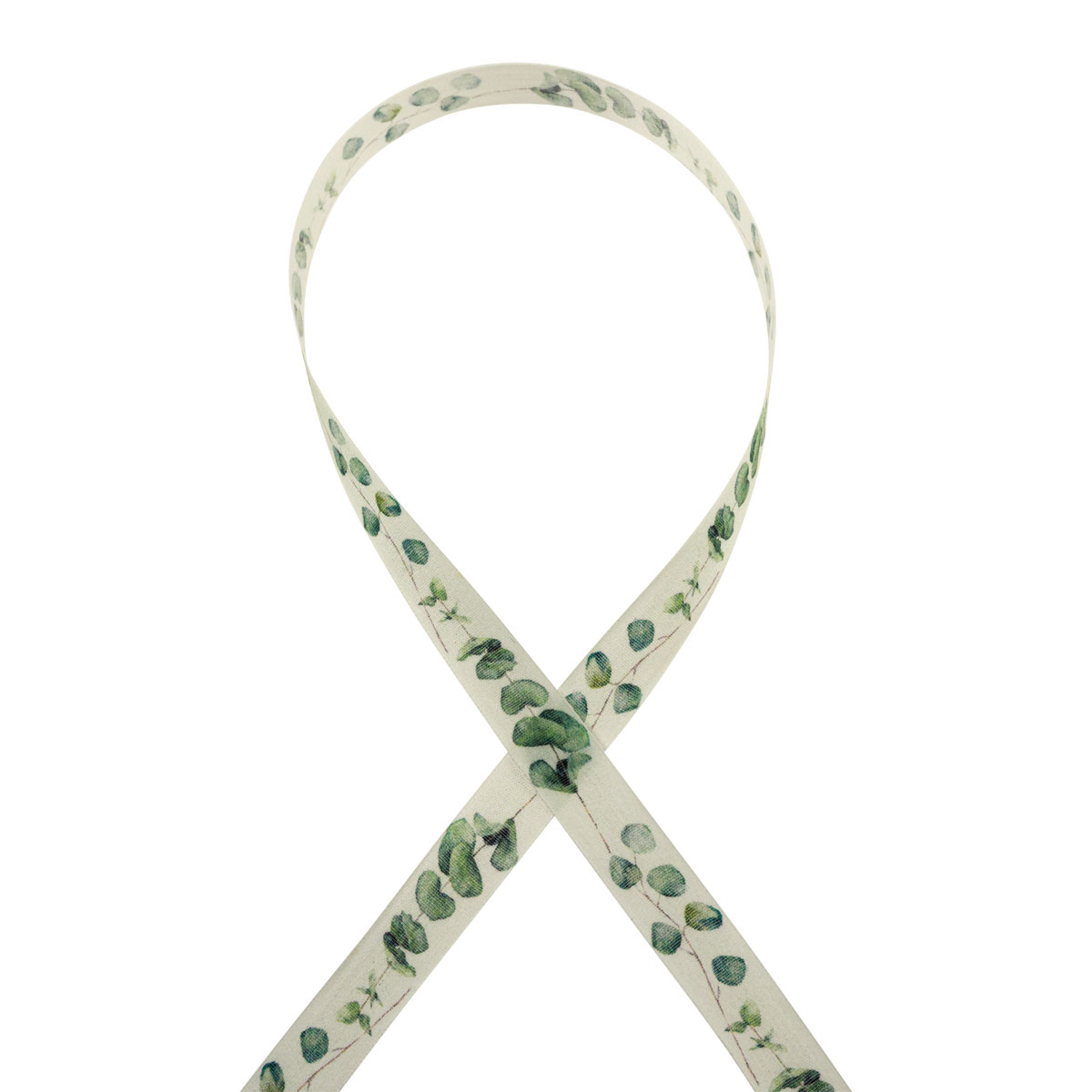 Das Motiv auf dem Geschenkband zeigt Eukalyptuszweige auf zartgrünem Grund. Die aufgedruckten Eukalyptusblätter erinnern dabei an eine Aquarellzeichnung und wirken sehr zeitlos. Die Rückseite des Stoffbands bleibt weiß.