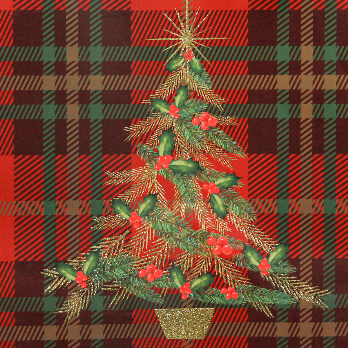 - Kariertes Rot-Grün-Design mit geschmücktem Weihnachtsbaum