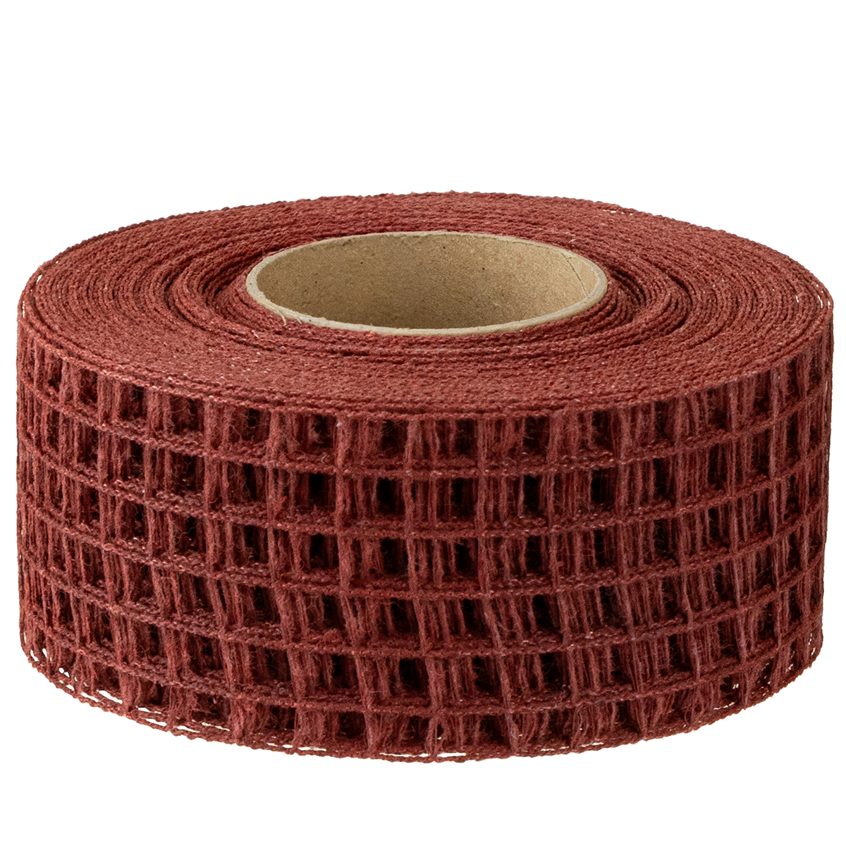 Das Gitterband in Bordeaux ist zu einer Rolle aufgewickelt und hat eine Länge von circa 10 Metern sowie eine Breite von etwa 4,5 Zentimetern.