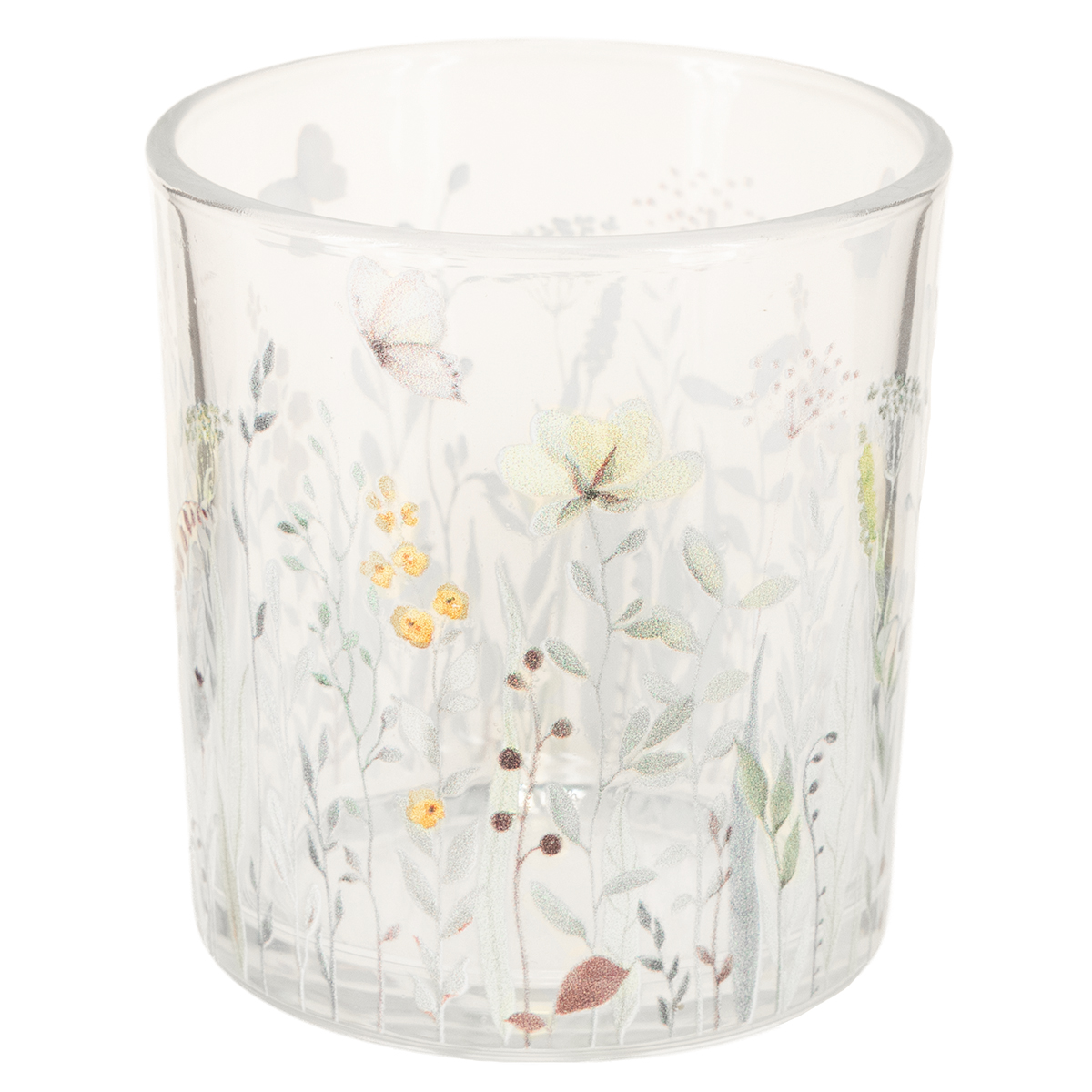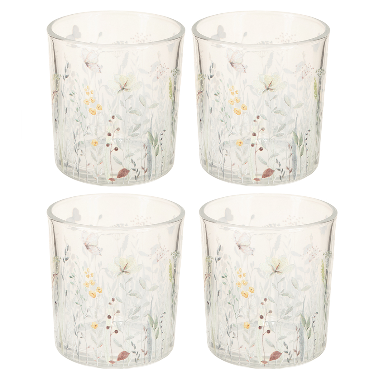 Produktname: Glas-Windlicht mit Schmetterlings- und Blumenmotiv für stilvolle Dekoration 12,5cm 4er-Set