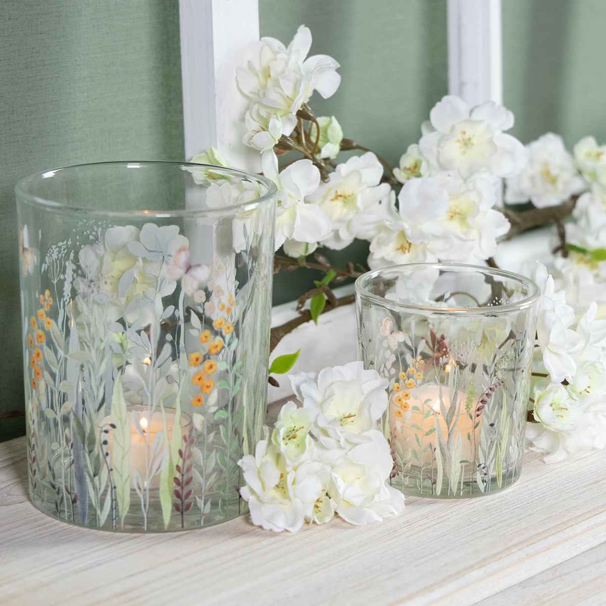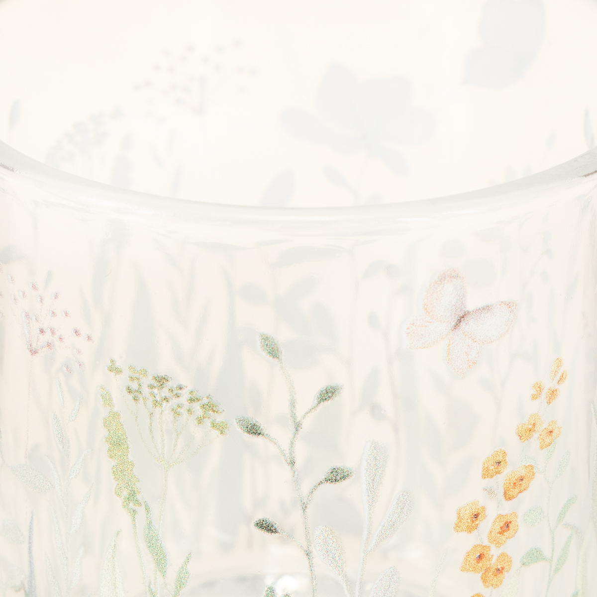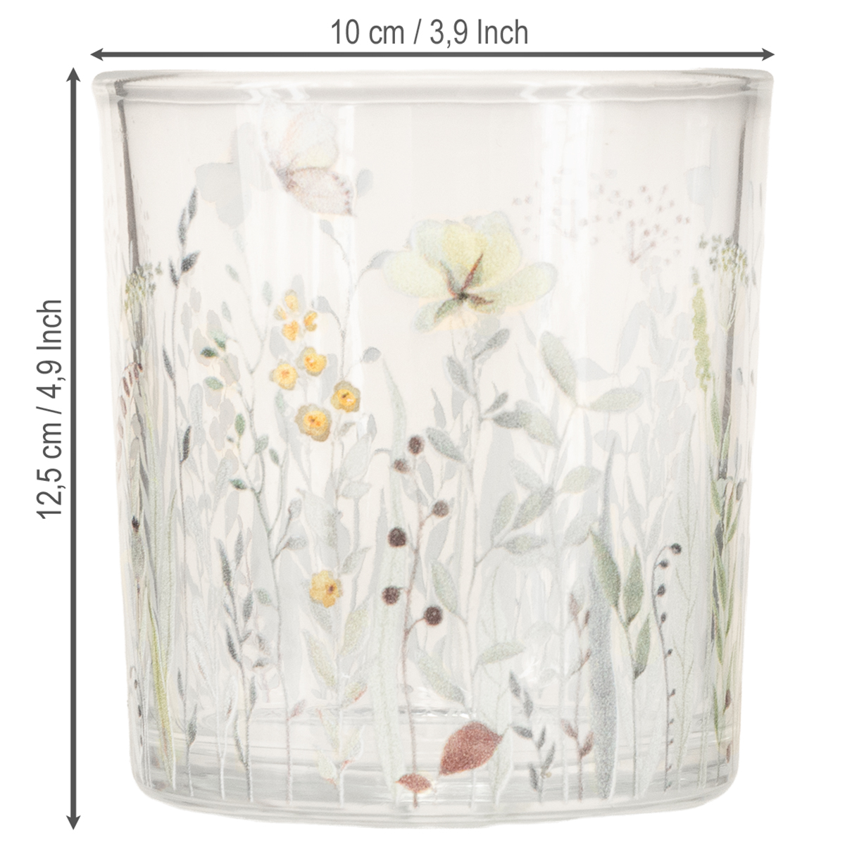 Holen Sie sich mit diesem Windlicht ein Stück Natur in Ihren Raum. Durch das detailverliebte Motiv aus schwebenden Schmetterlingen und zarten Blumen entsteht eine Atmosphäre, die Wärme und Harmonie ausstrahlt. Perfekt für florale und romantische Deko-Konzepte!